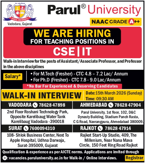 Note: Interested candidates can send their resumes to www.paruluniversity.ac.in/careers within 10 days of this Ad.